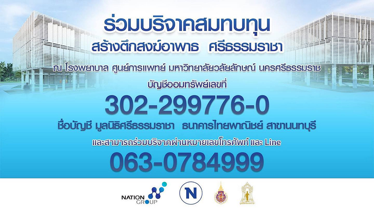โรงพยาบาลศูนย์การแพทย์ ม.วลัยลักษณ์ จ.นครศรีธรรมราช ผ่านบัญชีออมทรัพย์ เลขที่ 302-299776-0 ชื่อบัญชี มูลนิธิศรีธรรมราชา ธนาคารไทยพานิชย์ สาขานนทบุรีและสามารถร่วมบริจาคผ่านหมายเลขโทรศัพท์ 075-673088 ตั้งแต่บัดนี้เป็นต้นไป