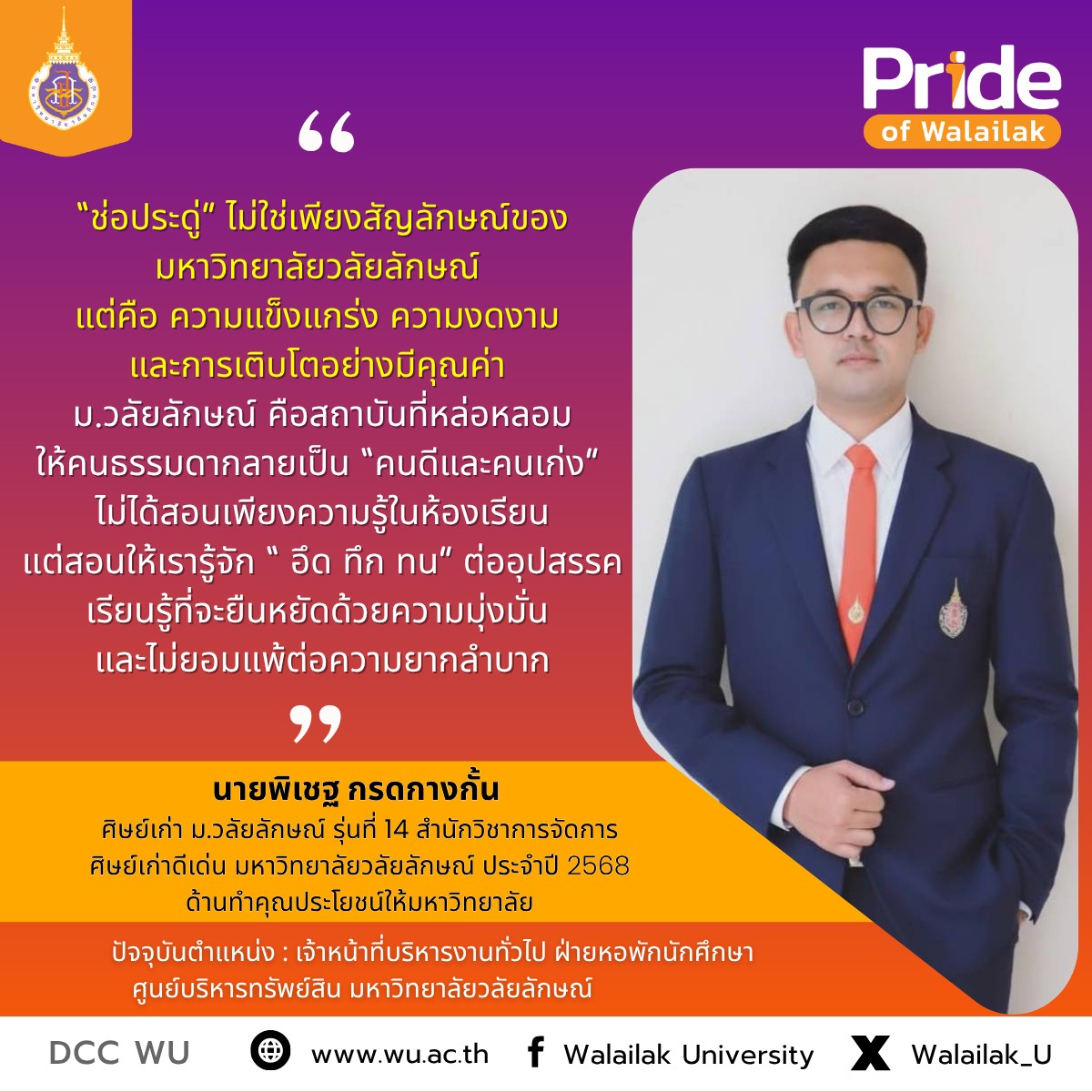 นายพิเชฐ กรดกางกั้น ศิษย์เก่ารุ่นที่ 14 สำนักวิชาการจัดการ และได้รับรางวัลศิษย์เก่าดีเด่น มหาวิทยาลัยวลัยลักษณ์ ประจำปี 2568 ด้านทำคุณประโยชน์ให้มหาวิทยาลัย