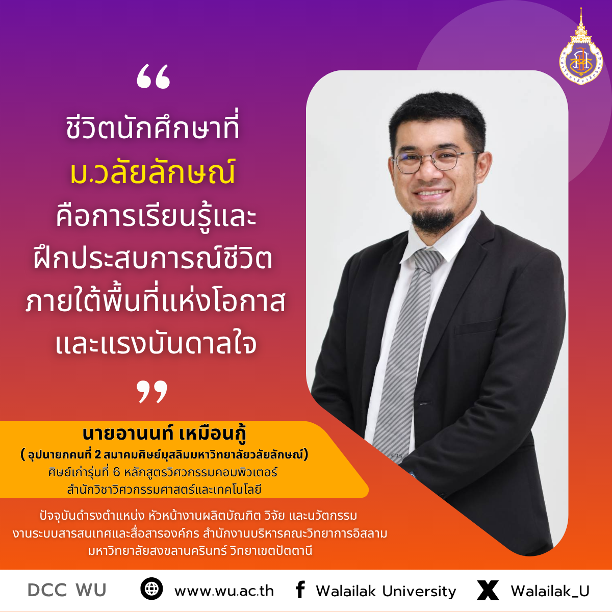 นายอานนท์ เหมือนกู้ ศิษย์เก่ารุ่นที่ 6 สำนักวิชาวิศวกรรมศาสตร์และเทคโนโลยี ปัจจุบันตำแหน่ง : หัวหน้างานผลิตบัณฑิต วิจัยและนวัตกรรม งานระบบสารสนเทศและสื่อสารองค์กร สำนักงานบริหาร คณะวิทยาการอิสลาม มหาวิทยาลัยสงขลานครินทร์ วิทยาเขตปัตตานี ตุลาคม 15, 2025 ไม่มีความเห็น